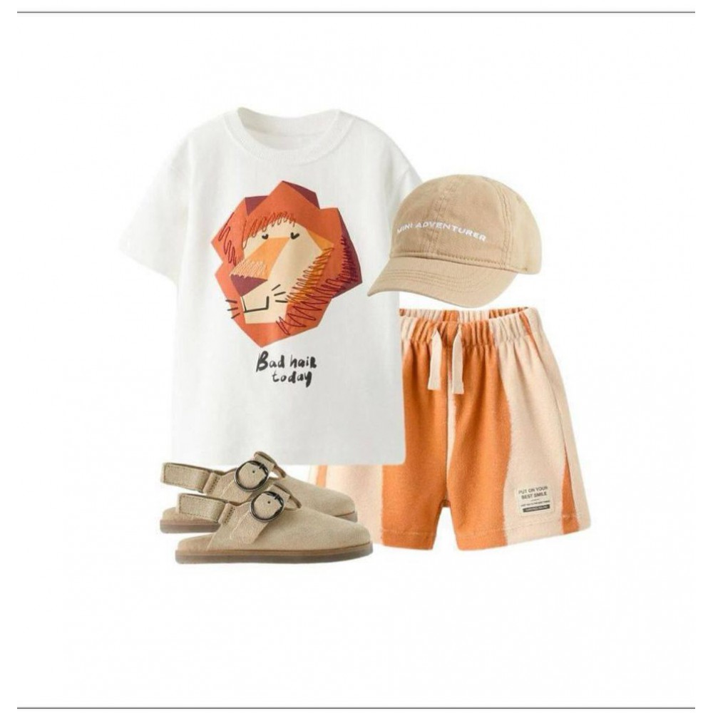 Eğlenceli tasarımıyla miniklerin favorisi olmaya aday bu erkek çocuk ikili takım, stil ve konforu bir araya getiriyor. Üst parçada yer alan sevimli aslan figürü hem çocukların ilgisini çekecek hem de eğlenceli bir tarz sunacak. Alt parçada ise canlı turuncu ve krem rengin geniş çizgili deseniyle enerjik bir görünüm elde edilmiştir.