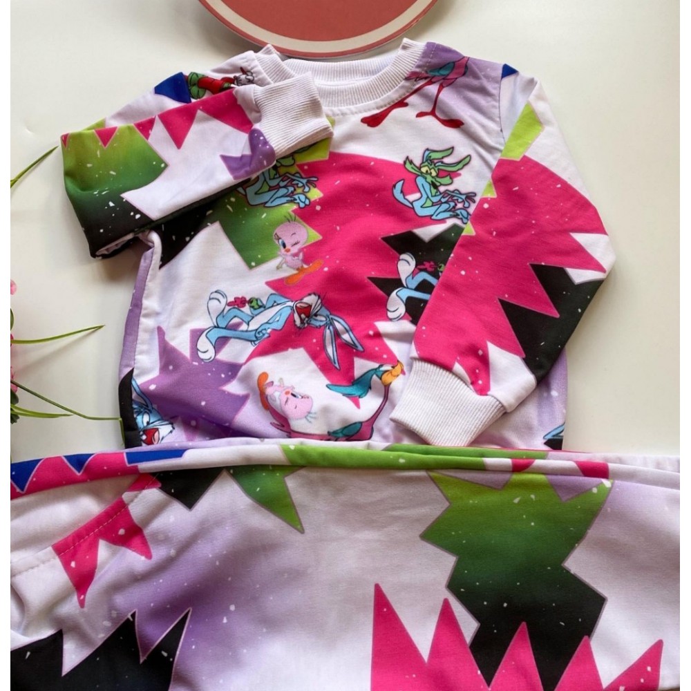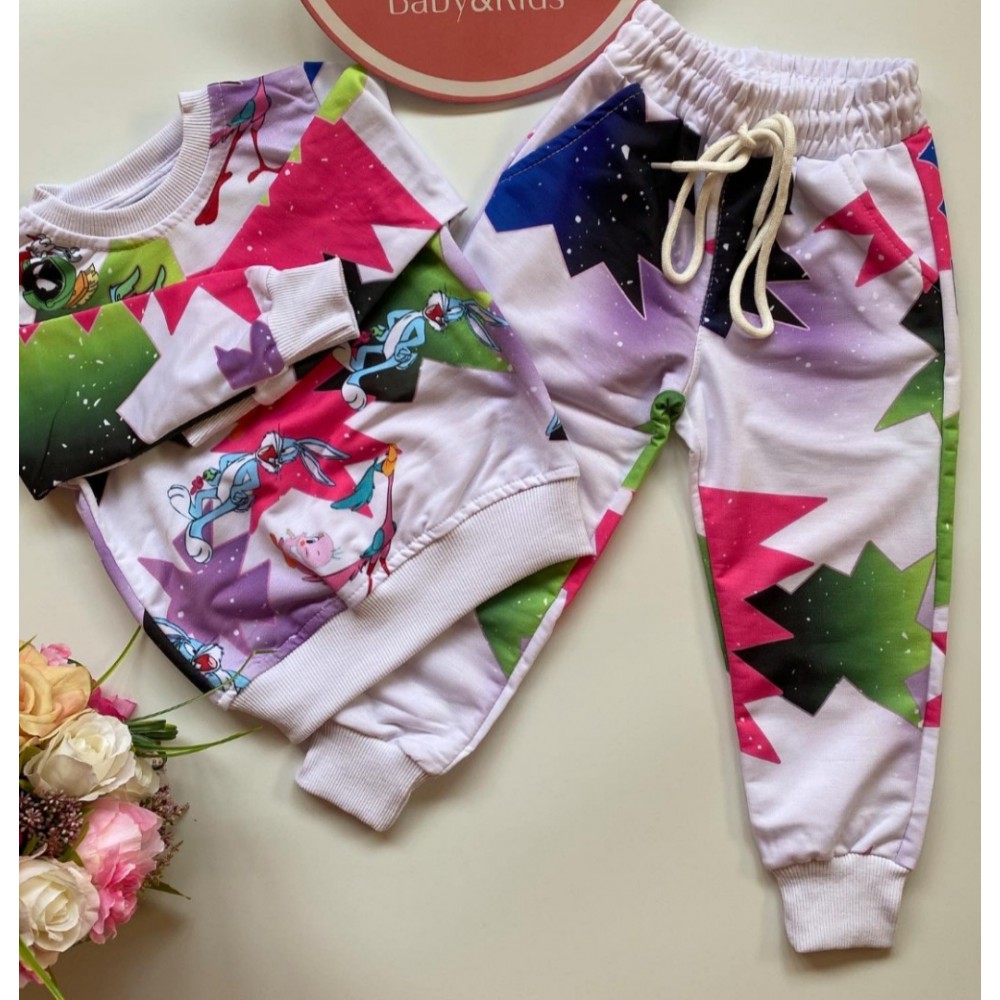Looney Tunes’un en sevilen karakterleriyle enerjik bir stil! Bugs Bunny, Tweety ve arkadaşlarının yer aldığı bu renkli çocuk eşofman takımı, neşeli deseni ve dikkat çekici tasarımıyla miniklerin favorisi olacak. Pembe, mor, yeşil ve siyah yıldız desenleriyle süslenen kumaşı, çocukların tarzına renk katarken, yumuşak dokulu pamuklu yapısıyla gün boyu konfor sağlar. Esnek bel yapısı ve bilek kısımları sayesinde rahat hareket imkânı sunar. Eğlenceli ve konforlu bir görünüm arayan çocuklar için mükemmel bir tercih!