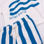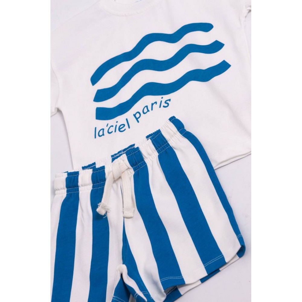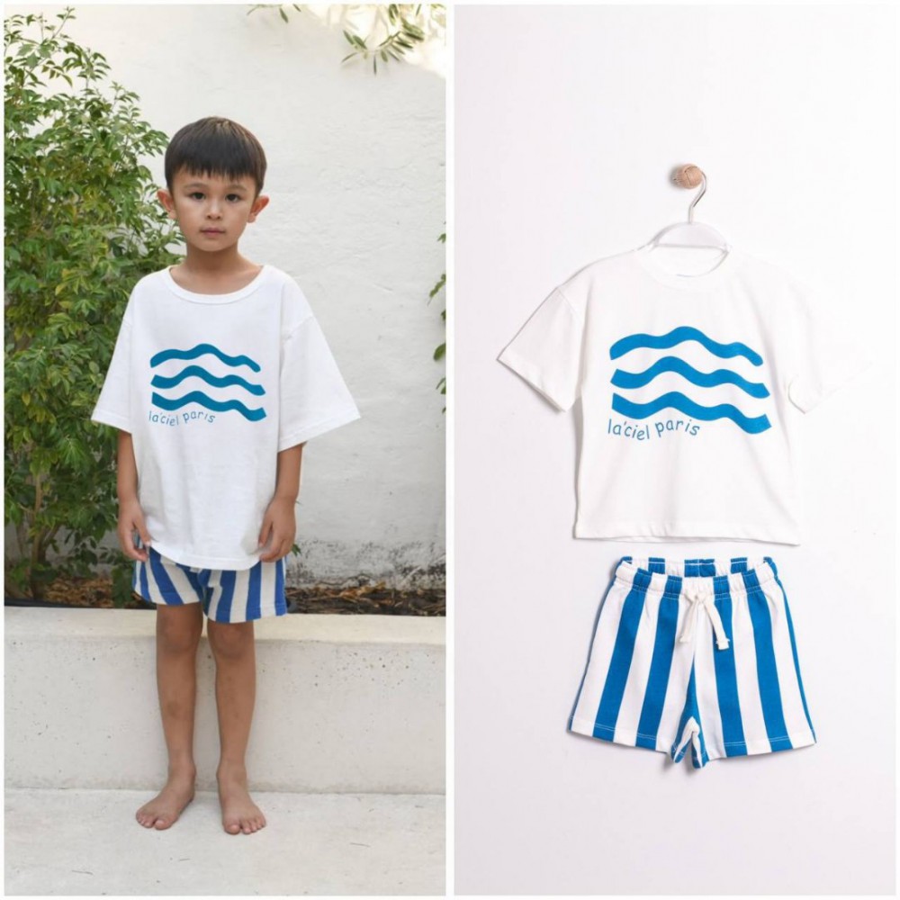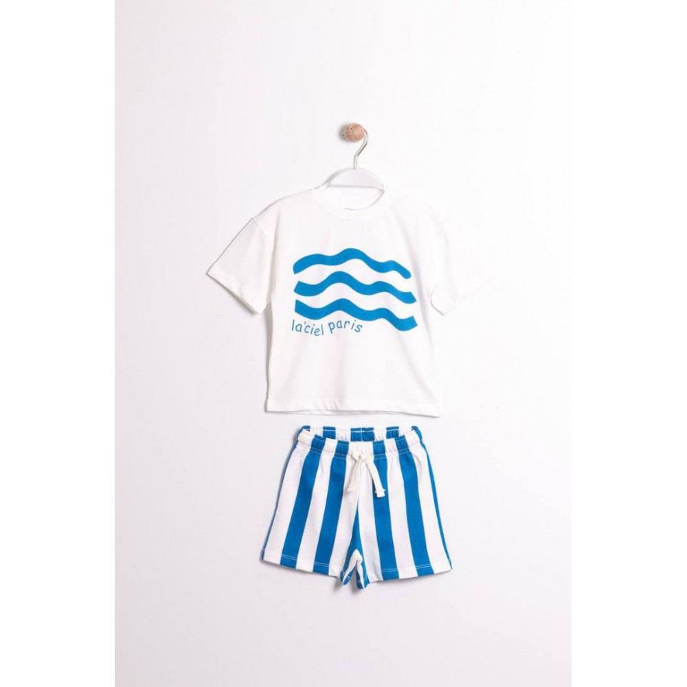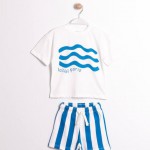 Küçük beylerin enerjisine en iyi eşlik edecek yazlık kombin! “Okyanus Esintisi” takımı, deniz dalgalarından ilham alan grafik baskılı beyaz tişörtü ve mavi-beyaz çizgili şortu ile tam bir sahil ruhu taşıyor. Hem rahat kalıbı hem de serin tutan pamuklu kumaşıyla sıcak yaz günlerinde vazgeçilmez olacak.