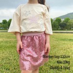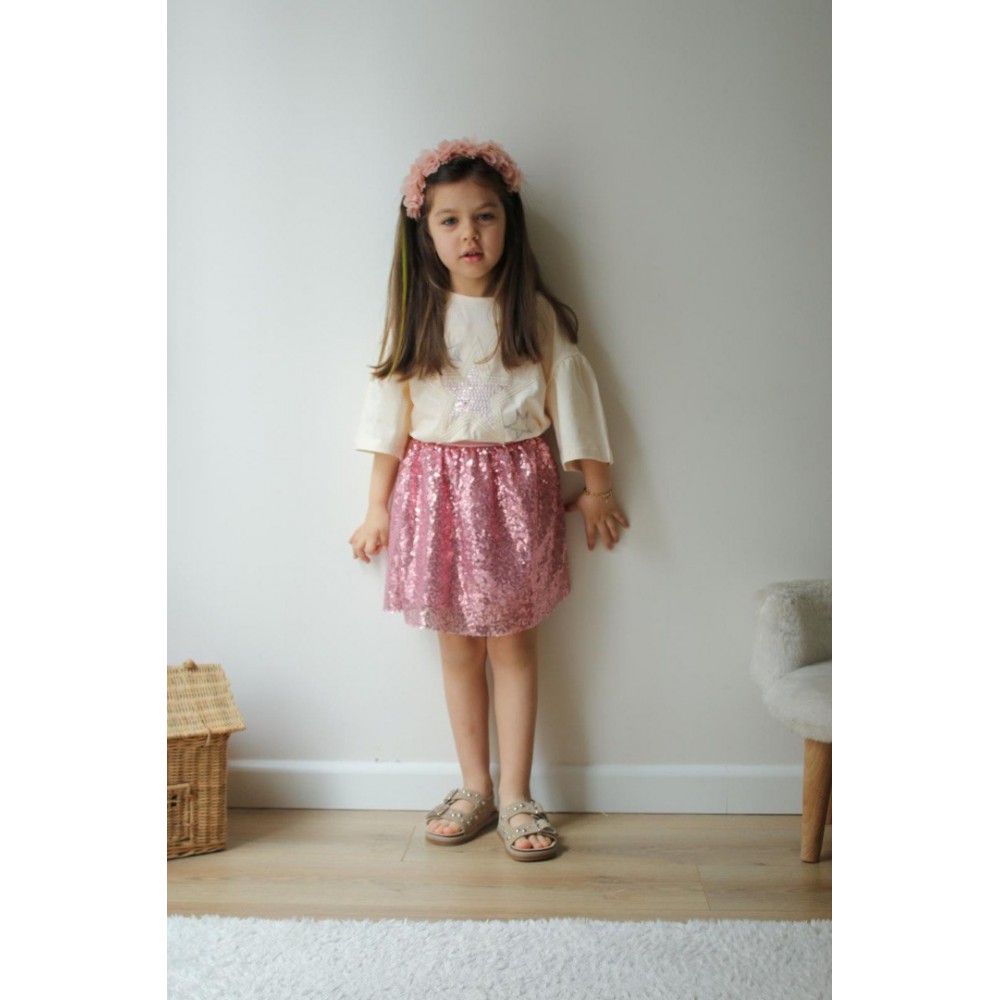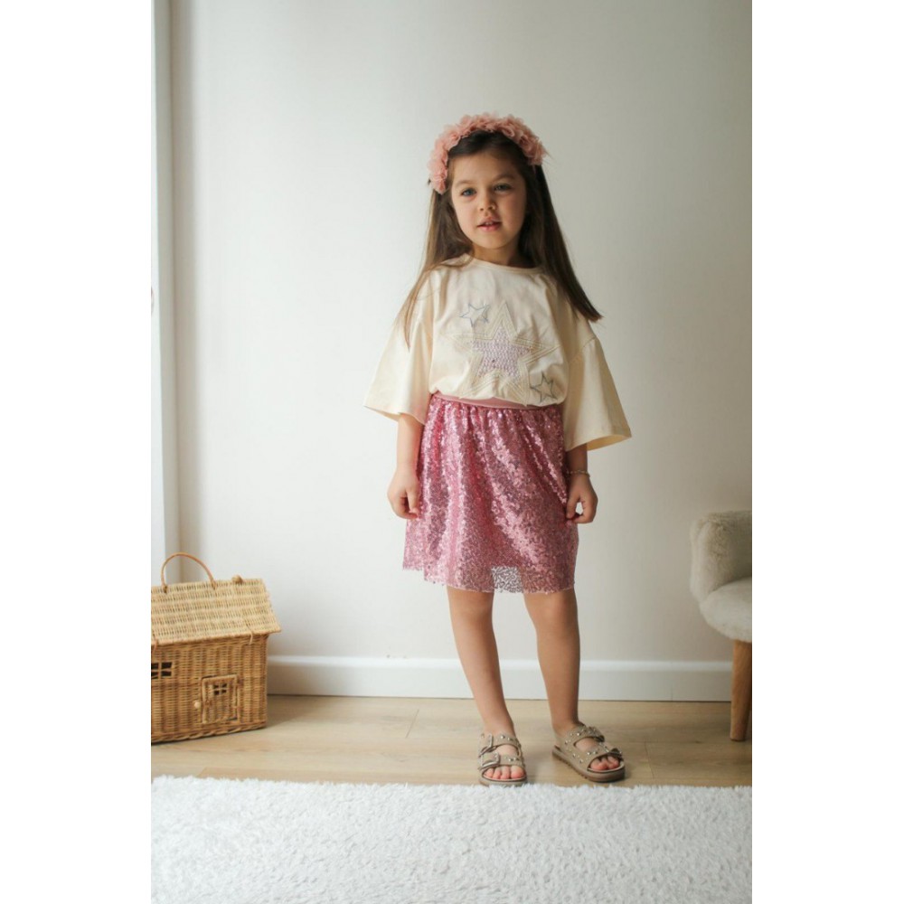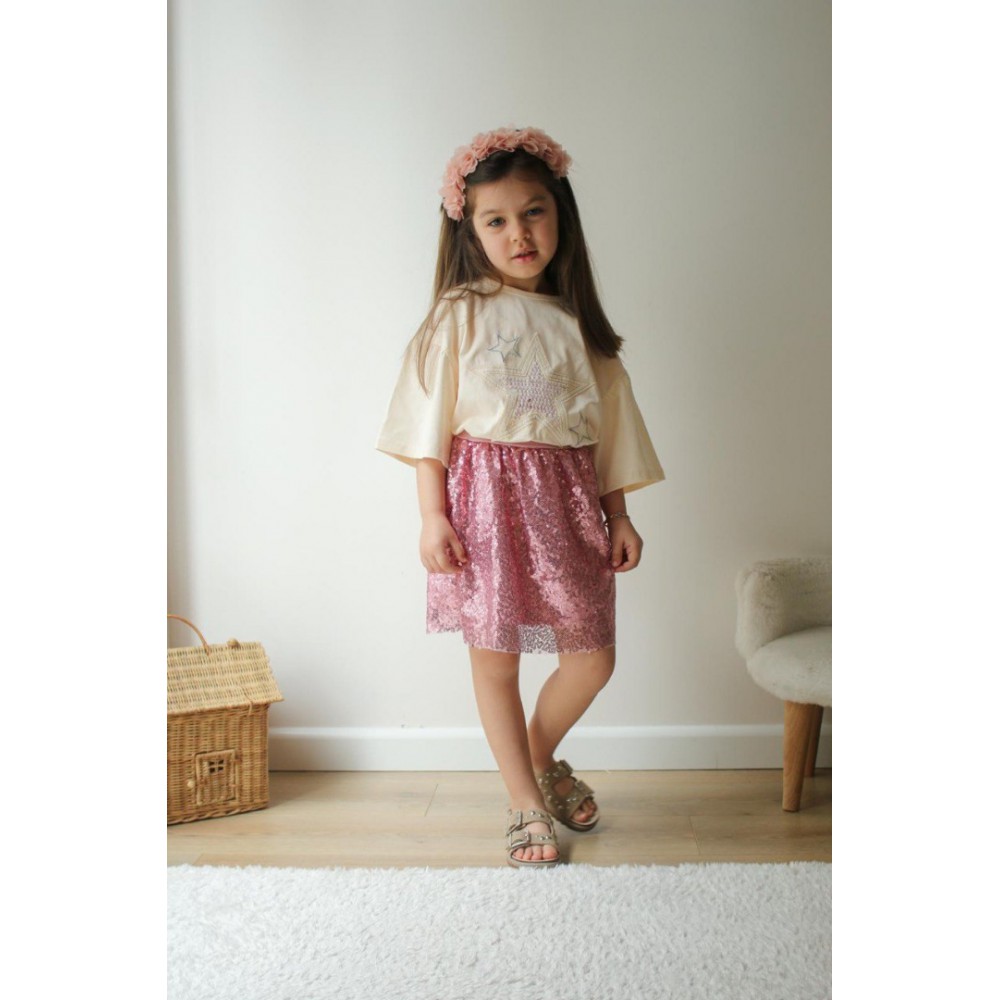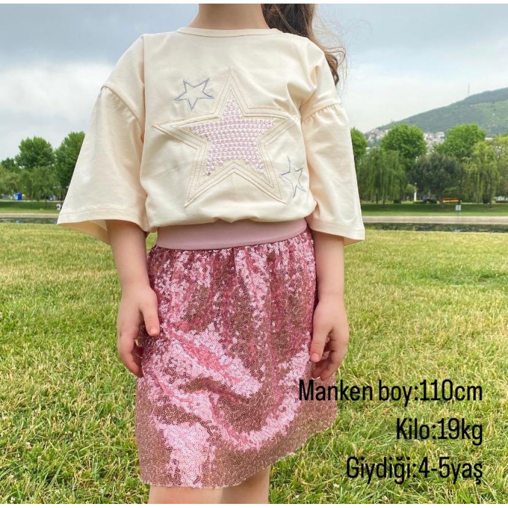 Işıltıyı seven minik prensesler için tasarlanmış bu özel kız çocuk takımı, zarafeti ve konforu bir arada sunuyor. Üst kısmında büyük yıldız desenli taş detaylara sahip oversize kesimli krem renkli bluz, altındaki göz alıcı pembe payetli etek ile adeta bir peri masalını andırıyor.